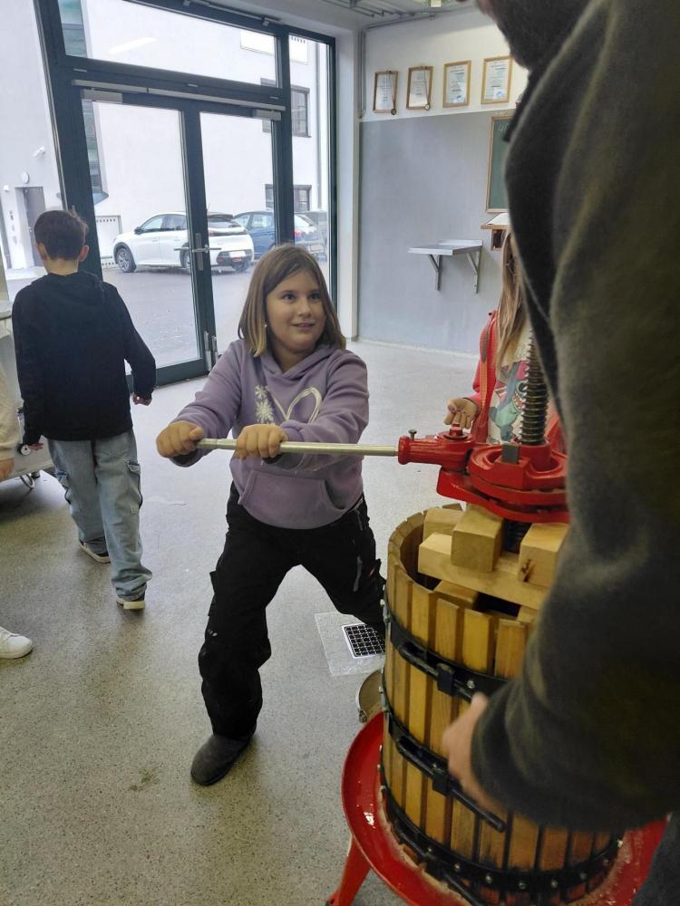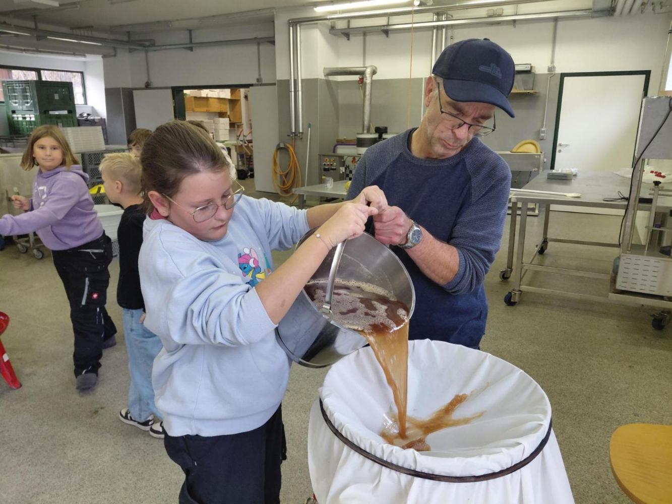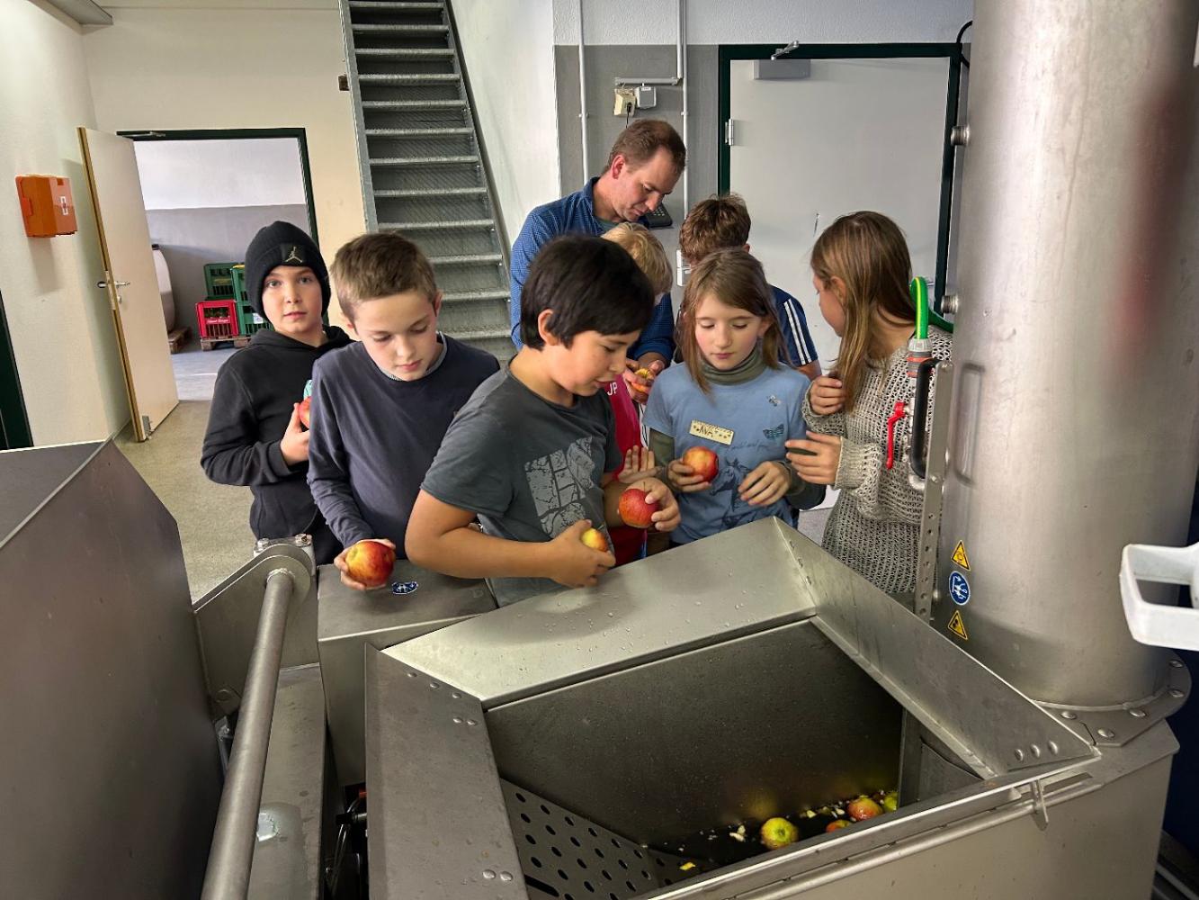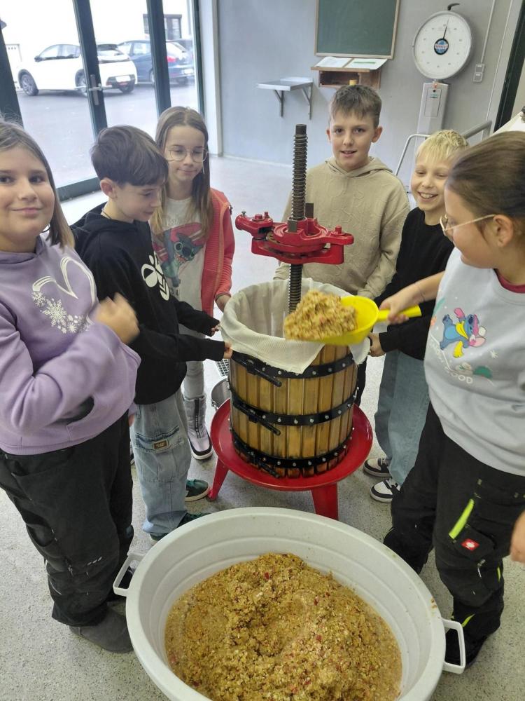 Nach einer Verkostung verschiedener Apfelsorten stand die Herstellung von frisch gepresstem Apfelsaft auf dem Programm. Vom Waschen und Zerkleinern der Äpfel über das Pressen und Pasteurisieren (im großen Kochtopf mit riesigem Kochlöffel) bis hin zum Abfüllen und anschließenden Verkosten konnten alle aktiv mitarbeiten.