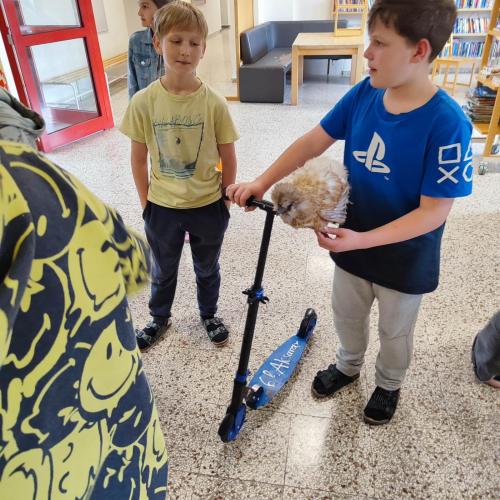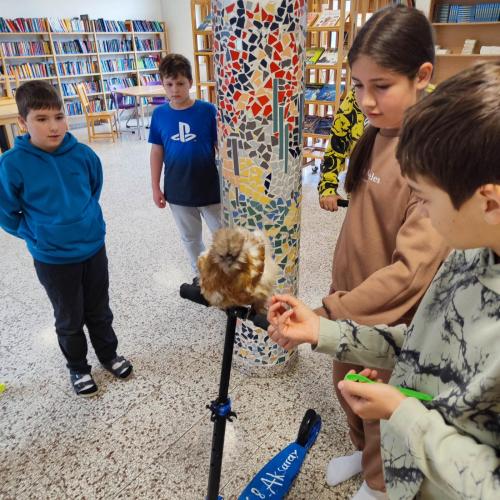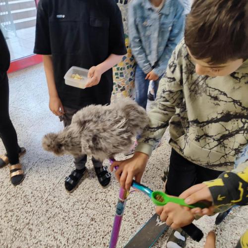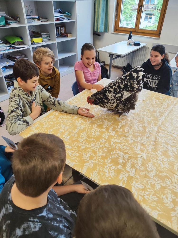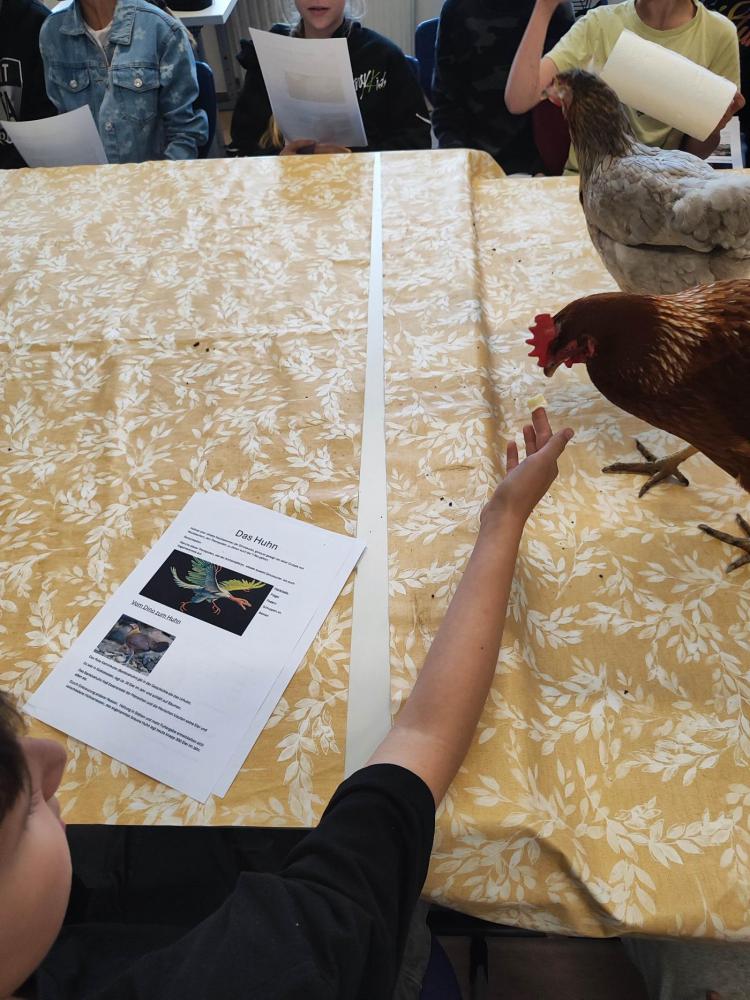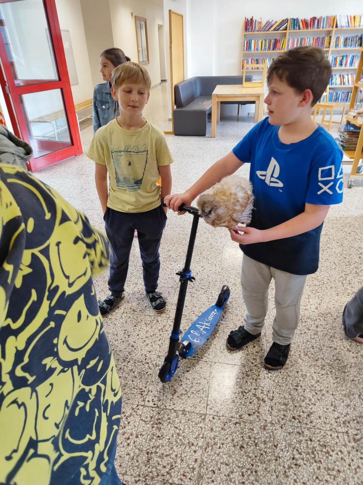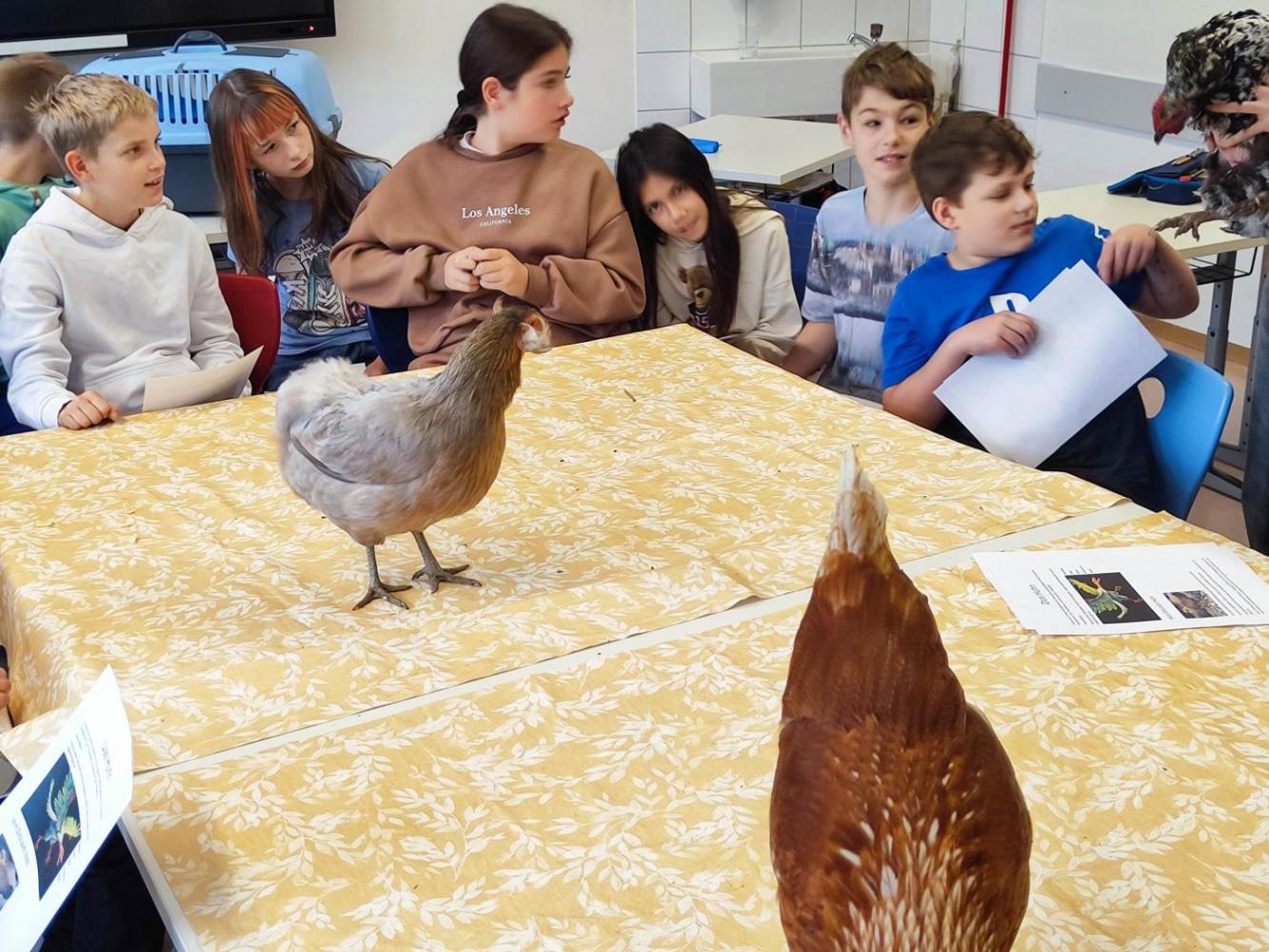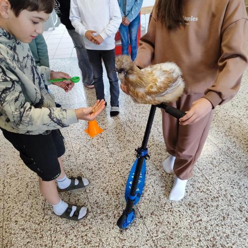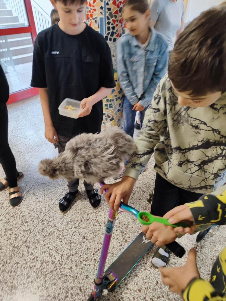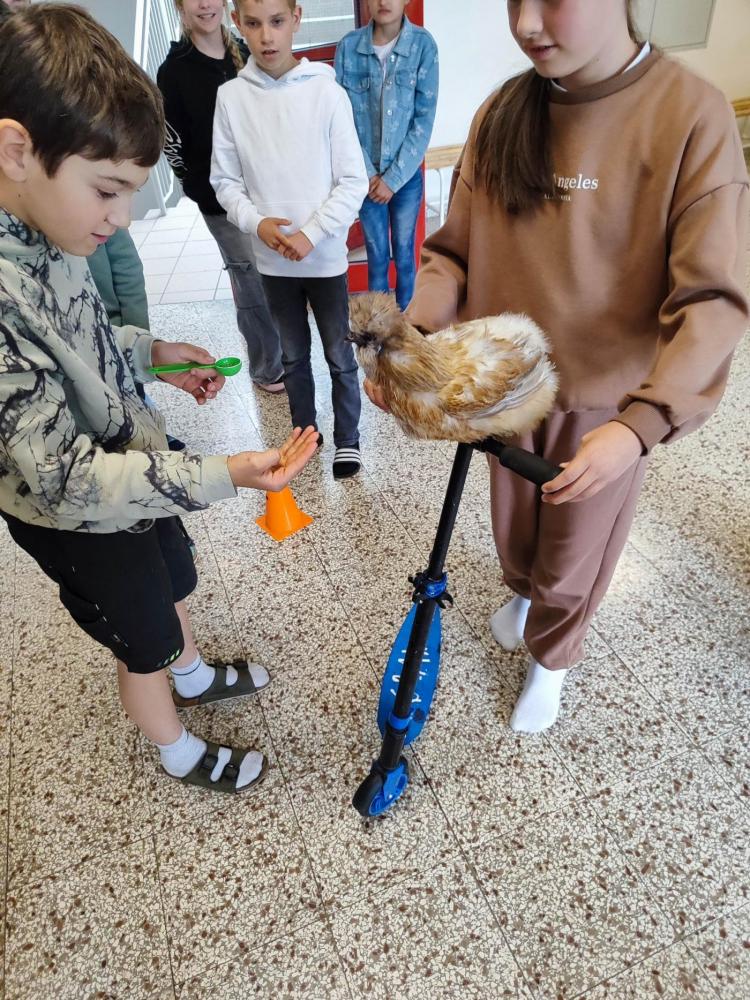 Natürlich durften die Hühner auch gefüttert und gestreichelt werden. Für besonders viel Heiterkeit sorgte ein lustiger Versuch – mutige Hühner fuhren auf einem Scooter und einem kleinen Skateboard durch die Schulgänge und sorgten für große Begeisterung.