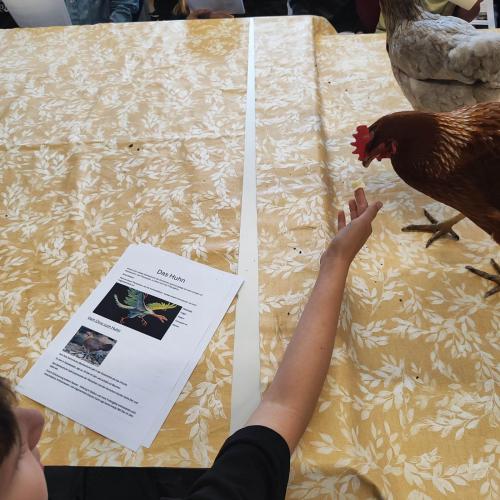 Die Kinder erfuhren, dass Hühner tatsächlich entfernte Verwandte der Dinosaurier sind – ein faszinierender Einblick in die Evolution. Gemeinsam untersuchten sie die körperlichen Merkmale der Tiere, sprachen über artgerechte Haltung und entdeckten ein kurioses Detail: Die Farbe der Eier lässt sich oft an der Ohrscheibenfarbe der Hühner erkennen!