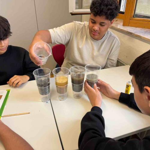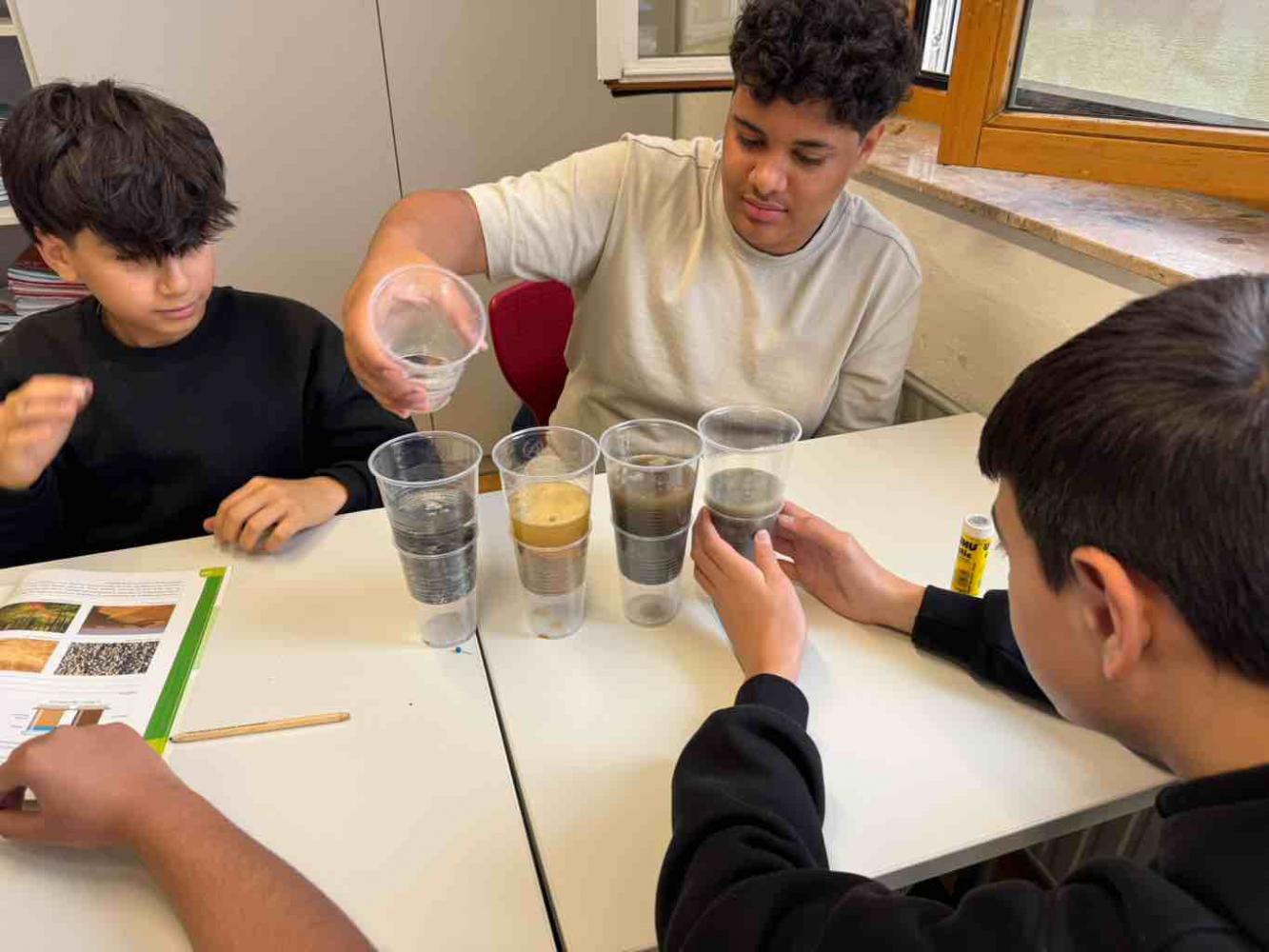 Ziel des Experiments war es, herauszufinden, wie gut unterschiedliche Böden Wasser durchlassen oder speichern können. Dafür wurden vier Bodenproben verglichen: Sand, Kies, Lehm und Waldboden.