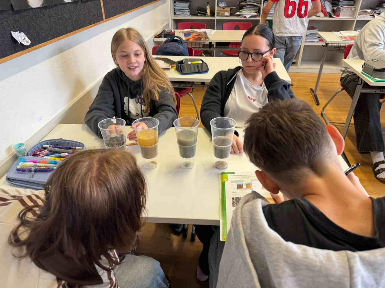 Der Aufbau war einfach: jeweils vier durchlöcherte Becher wurden mit den verschiedenen Bodenproben befüllt, auf Auffangbecher gestellt und mit Wasser übergossen. So konnte genau beobachtet werden, wie schnell oder langsam das Wasser jeweils durch die Böden sickerte.