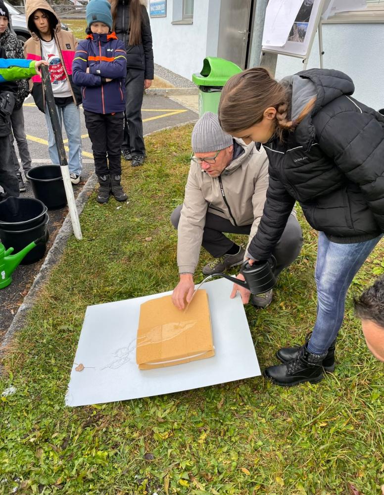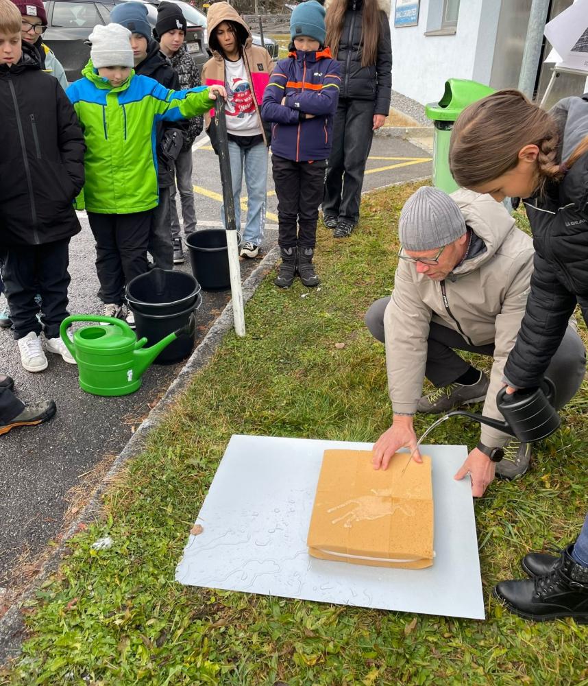 Die Klasse konnte anhand eines anschaulichen Experimentes beobachten, wie Wasser aus einer wasserführenden Schicht an die Oberfläche tritt – ein faszinierendes Naturphänomen, das den Weg unseres Trinkwassers verständlich machte.