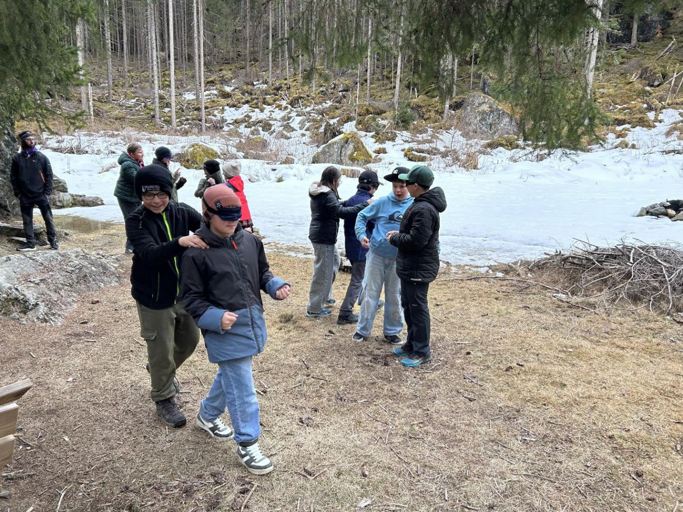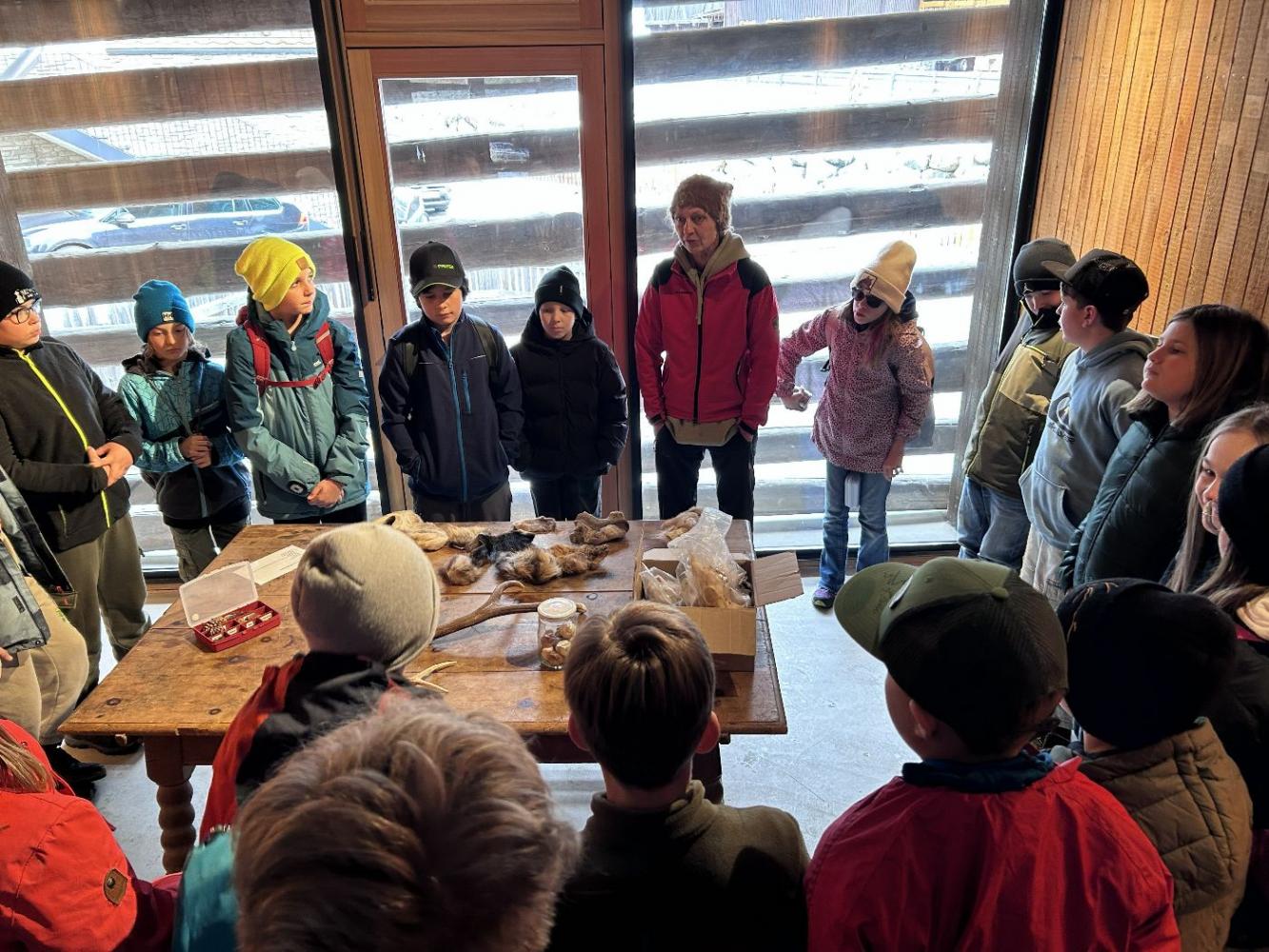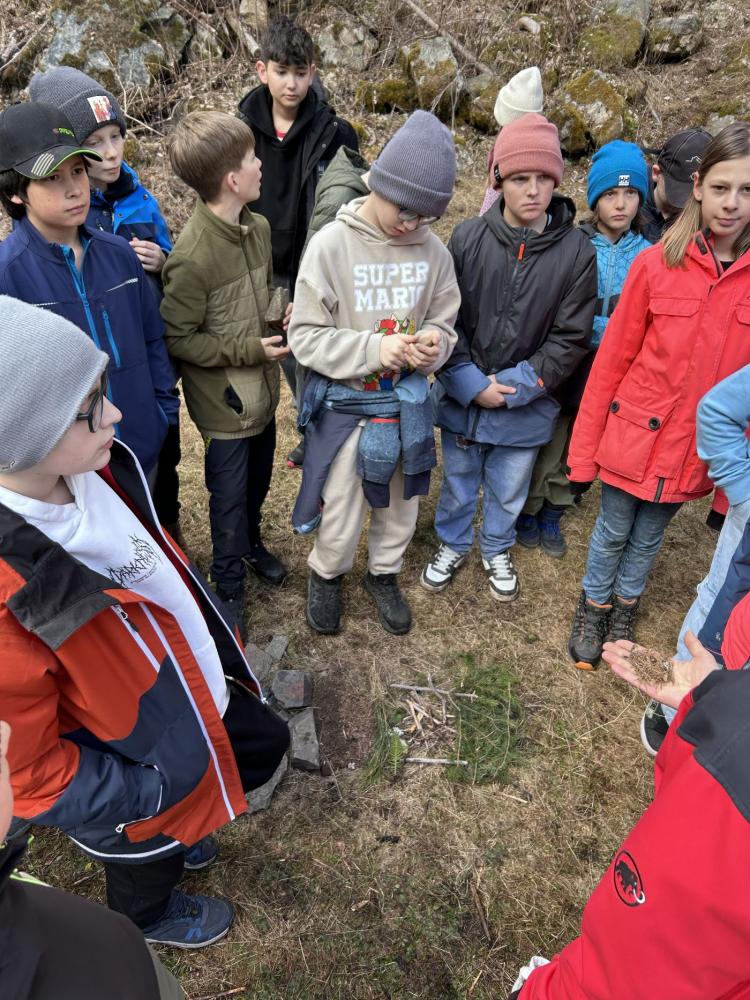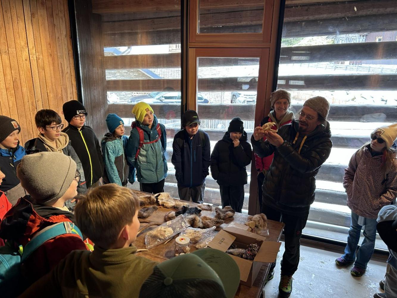 Unser Ausflug begann in der Alten Mühle in Ritzenried. Dort konnten wir Spuren von Tieren aus dem Wald hautnah entdecken. Wir sahen Abwurfstangen, verschiedene Losungen, Fraßspuren sowie Schädelknochen. Besonders spannend war, dass wir die Felle verschiedener Tiere anfassen und genauer untersuchen durften – dabei stellten wir fest, dass nicht alle gleich flauschig sind und man noch Krallen spüren kann.