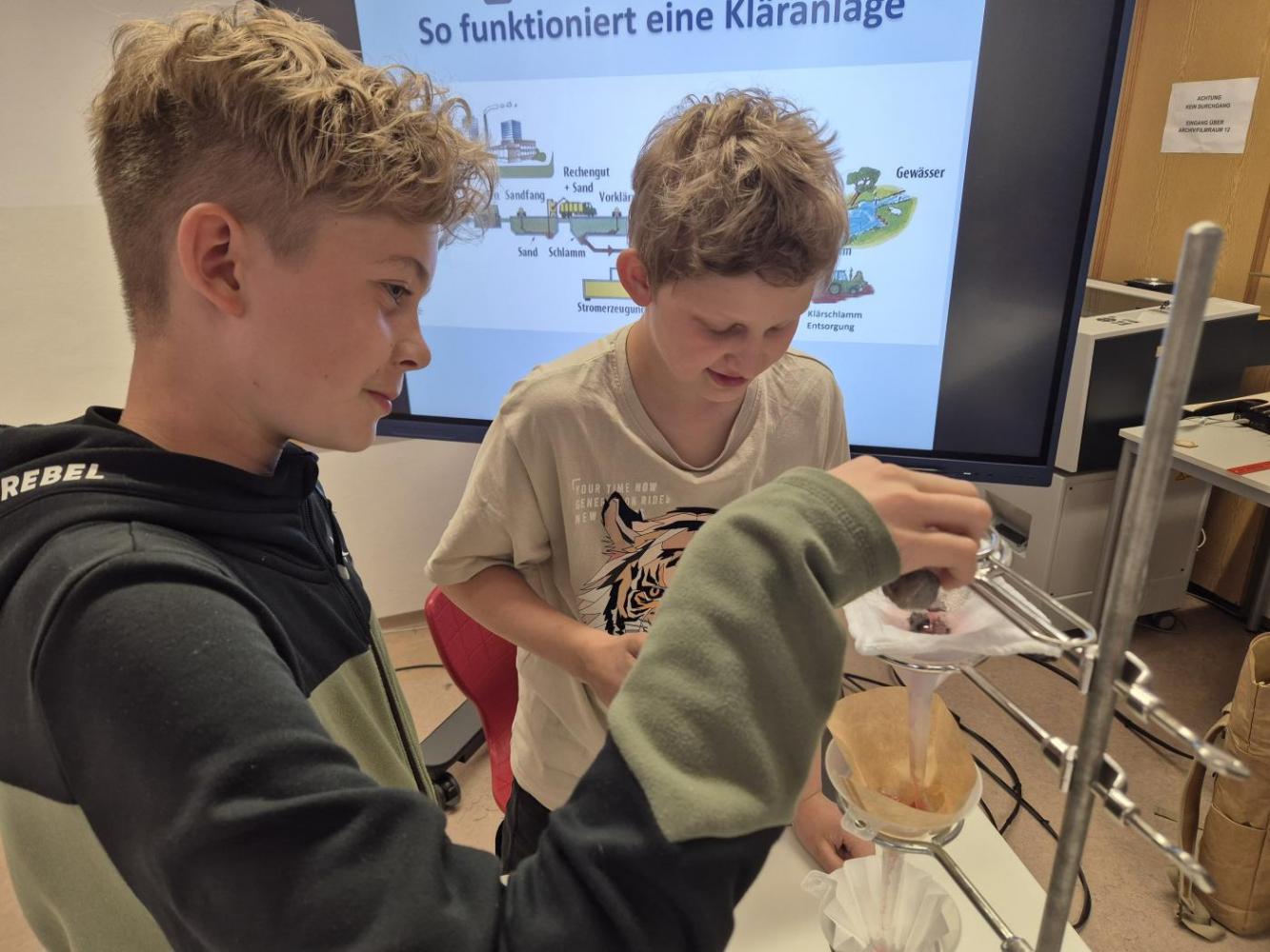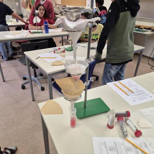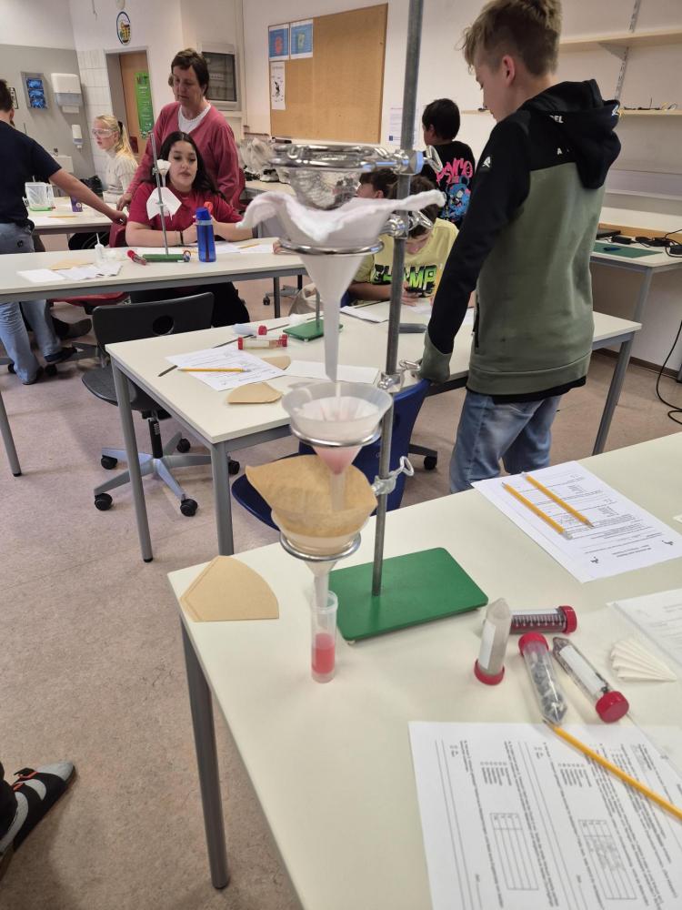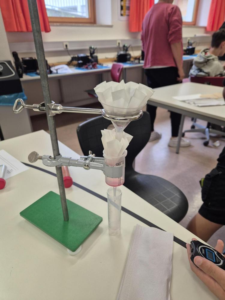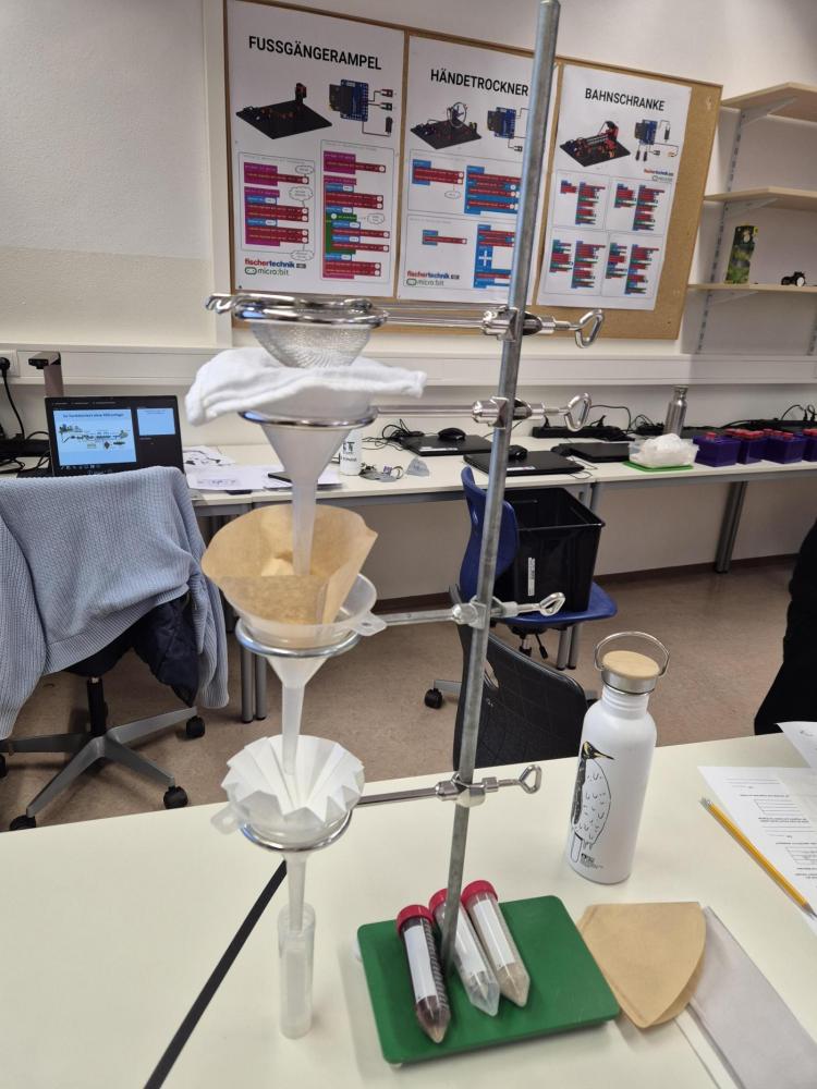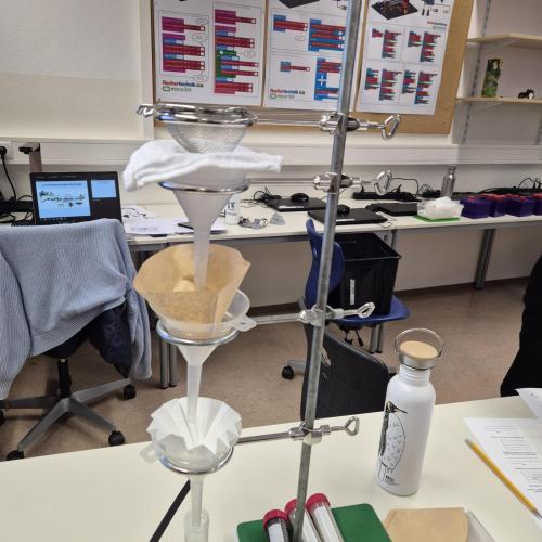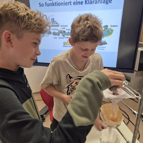 Der Nachmittag begann mit einem theoretischen Teil, in dem die Jugendlichen den Aufbau und die Funktionsweise einer modernen Kläranlage kennenlernten. Anschließend wurde selbst geforscht und experimentiert: In Kleingruppen testeten die Schüler:innen verschiedene Filtermaterialien wie Aktivkohle, Sand, Kies, Filterpapier, Küchenrolle und sogar Baumwollwindeln. Ziel war es, verschmutztes Wasser möglichst effektiv zu reinigen – eine Herausforderung, die mit viel Engagement und Neugier angenommen wurde.