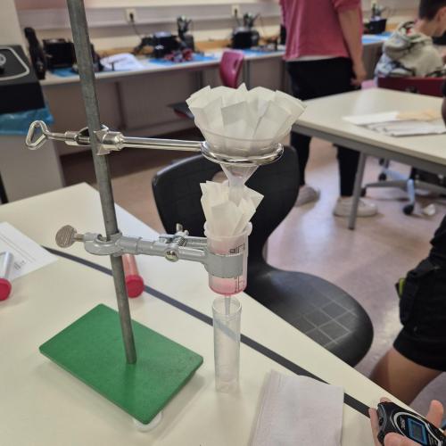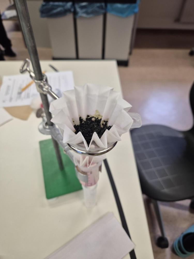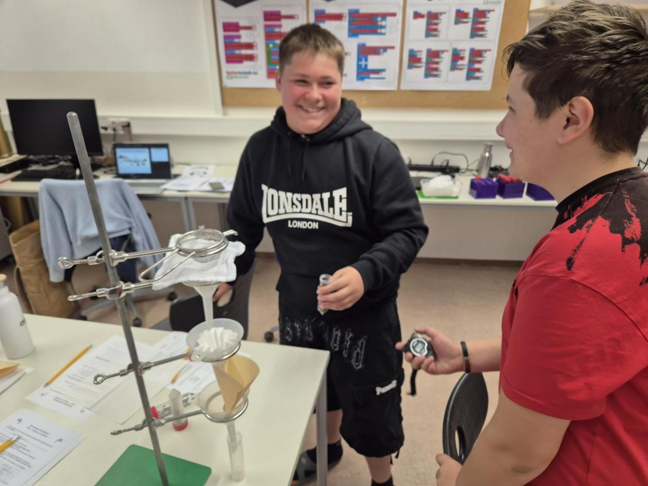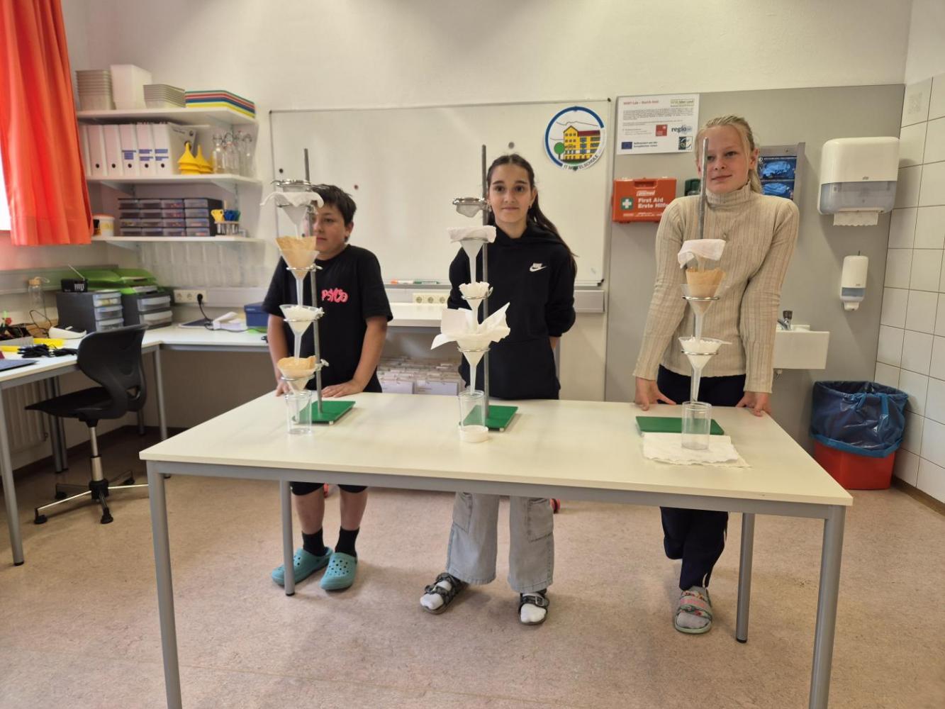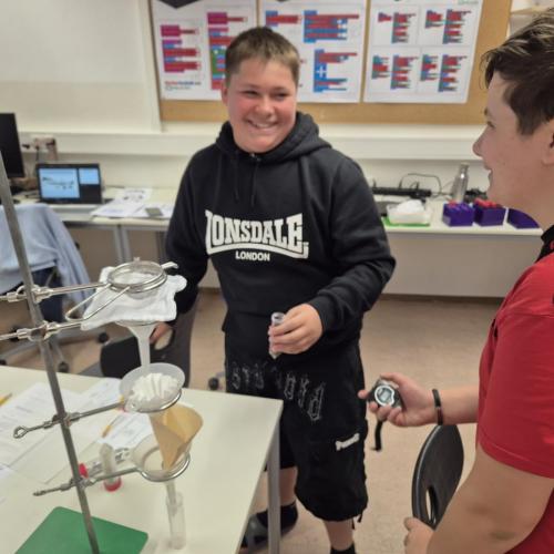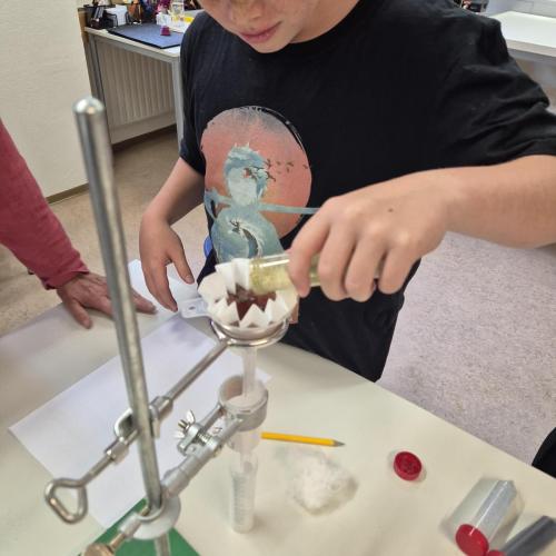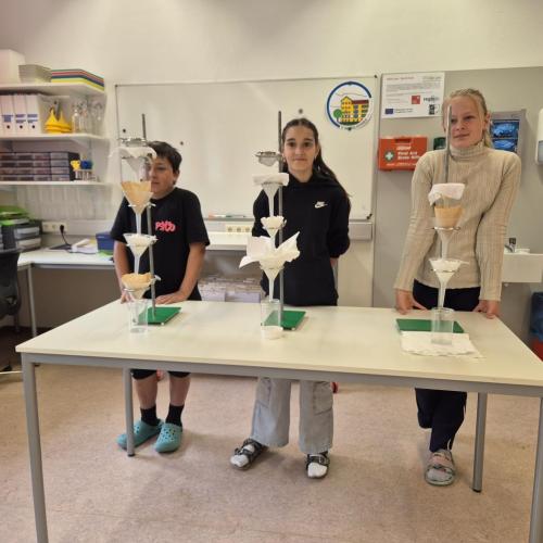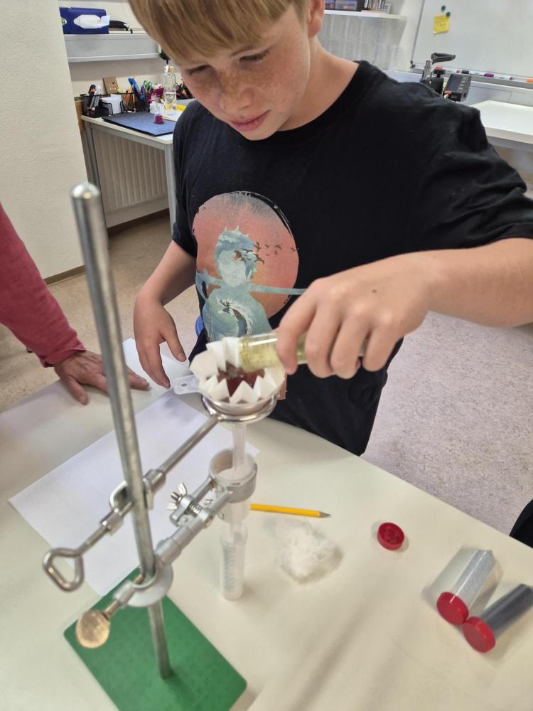 Der Nachmittag begann mit einem theoretischen Teil, in dem die Jugendlichen den Aufbau und die Funktionsweise einer modernen Kläranlage kennenlernten. Anschließend wurde selbst geforscht und experimentiert: In Kleingruppen testeten die Schüler:innen verschiedene Filtermaterialien wie Aktivkohle, Sand, Kies, Filterpapier, Küchenrolle und sogar Baumwollwindeln. Ziel war es, verschmutztes Wasser möglichst effektiv zu reinigen – eine Herausforderung, die mit viel Engagement und Neugier angenommen wurde.
